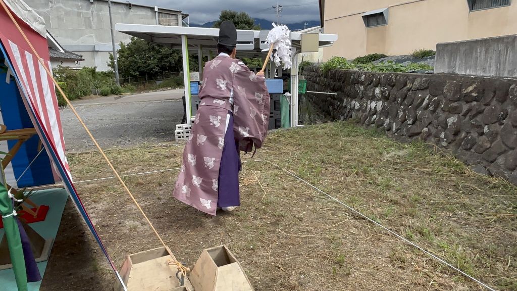 まずは四方祓いにて、神主さんが土地を清め、神様へ挨拶を行います。昔より、四方を清めることであらゆる災厄から家を守る意味があるとされています。