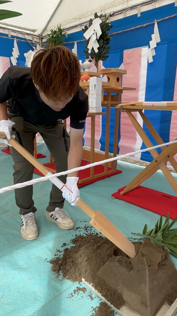 鍬入れ(くわいれ)の儀は現場監督の丸山が「エイ、エイ、エイ!」と大きな声をかけて、土地の神様に工事の開始を奉告し、無事を祈りました🍃