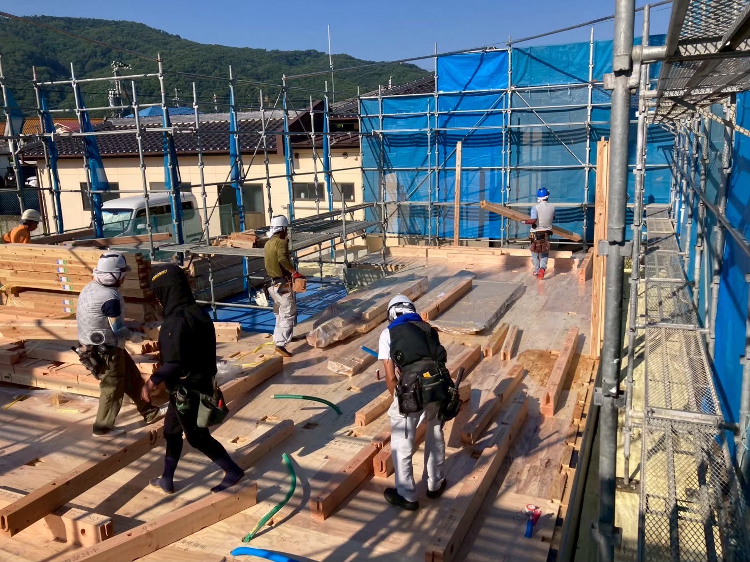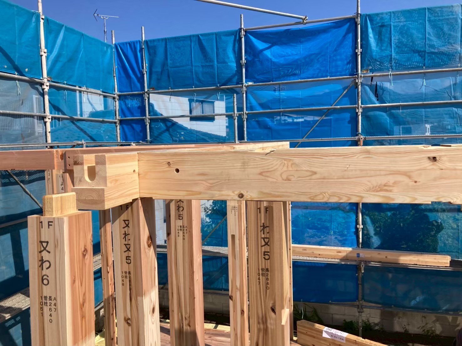 いつものように慣れた大工さんたちにより、着々と柱を組み上げていき、午前中には1階部分がほぼ組み合がりました。