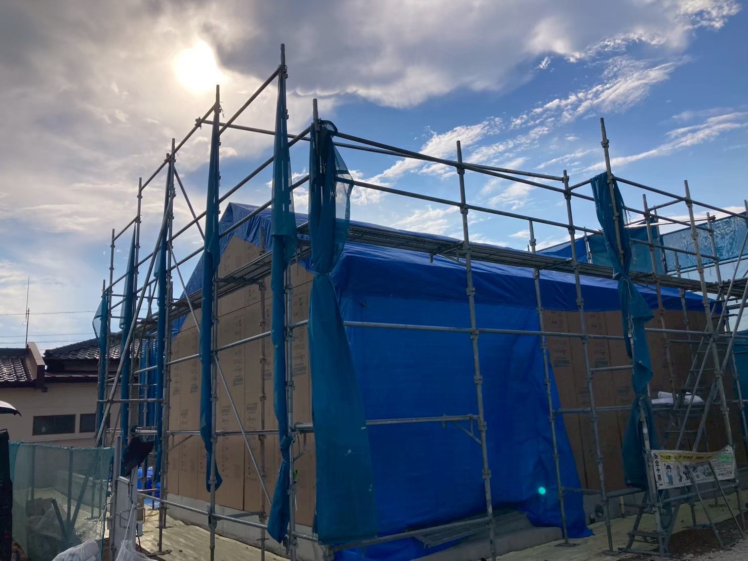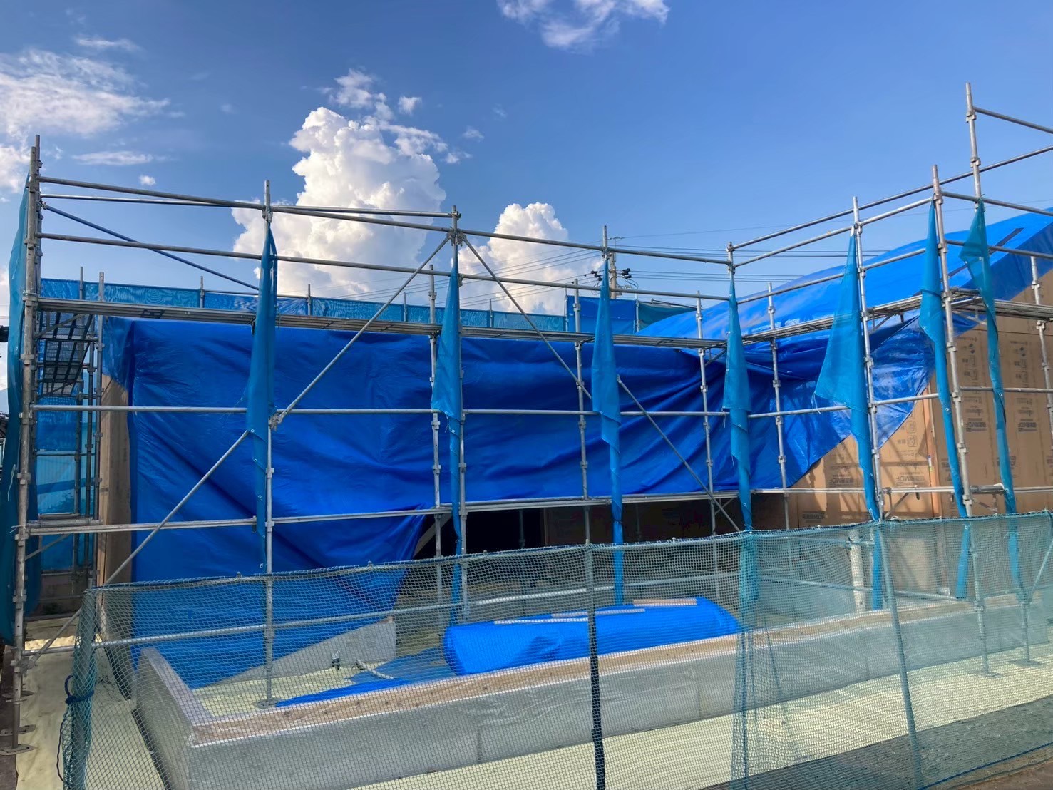 夕方には壁と屋根のボード張りも完了し、建物全景が姿を見せました。N様邸は市街地にあるので、目隠し塀用の基礎も出来上がっています。フェンス完成後の中庭の完成も楽しみです✨