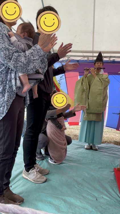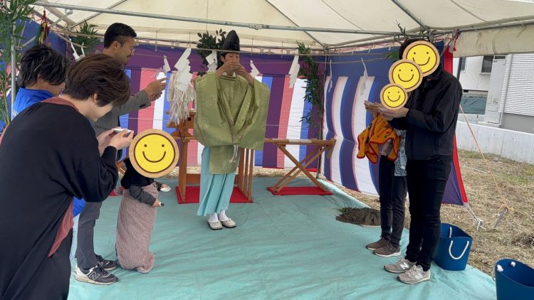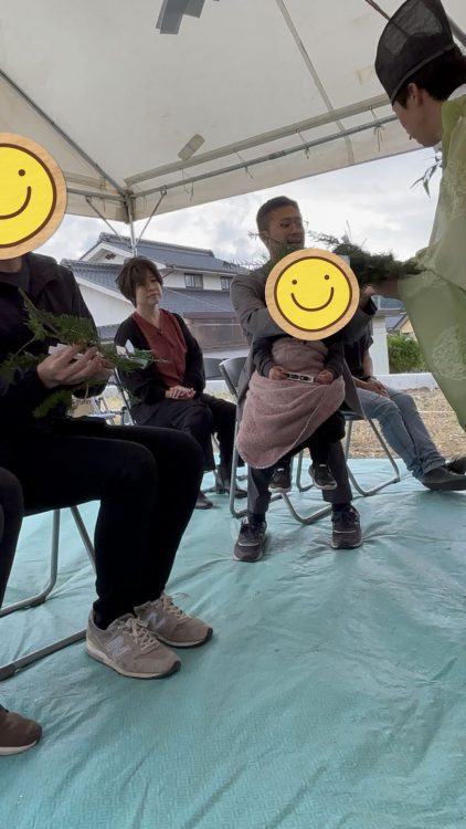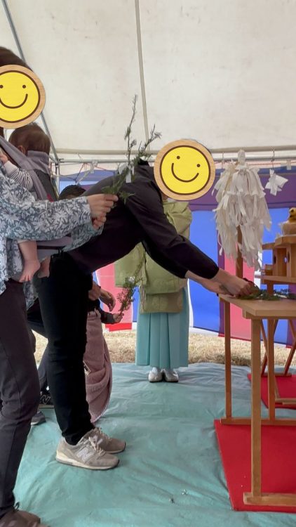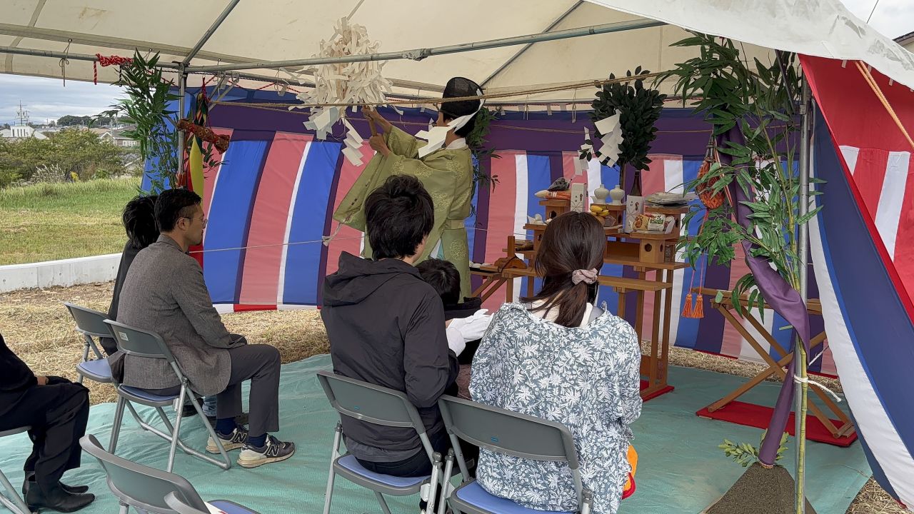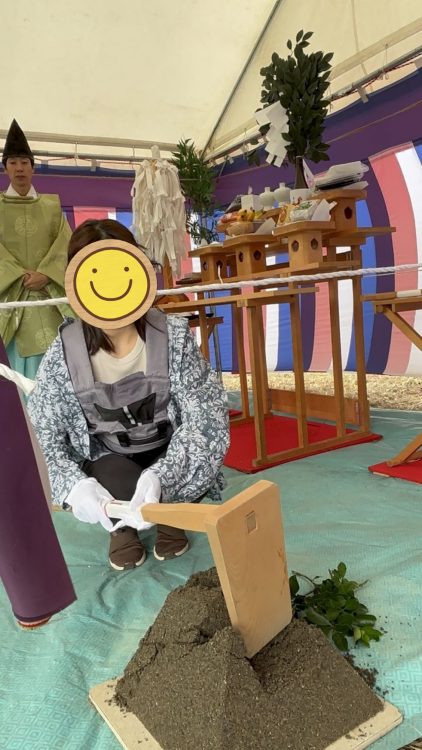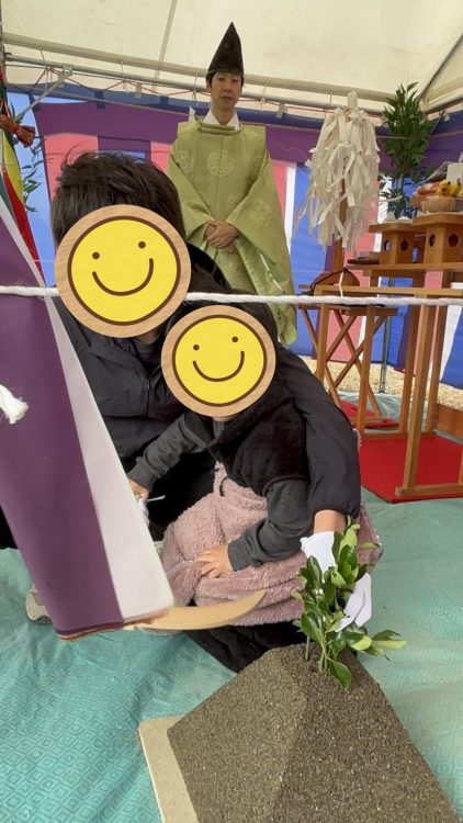 地鎮の儀では、ご主人とお子様お二人で刈初(かりそめ)の儀を奥様が穿初(うがちぞめ)の儀を担っていただきました。その後、現場監督の古畑が鍬入れの儀を行い、土地を鎮める儀式を無事に行いました。