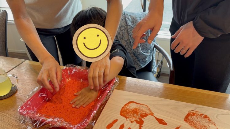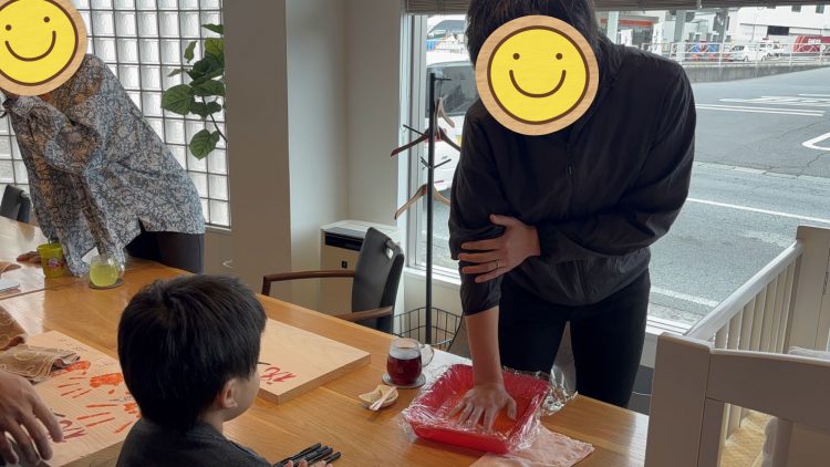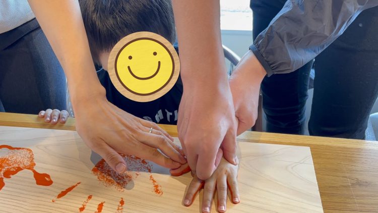 続いて、奥様にも押していただいた後、お子様にも朱墨を付けていただきます。お父さんとお母さんにしっかりと上から押さえてもらって、綺麗な手形を付けていただきました。