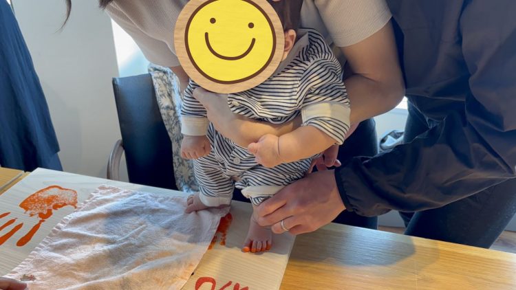 最後は、生後2か月ちょっとのお子様にも押していただきます。手では無く、足形を付けていただきました。かわいい✨