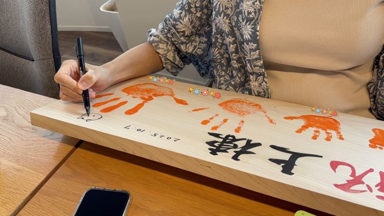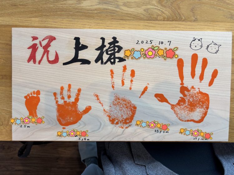 右上には奥様が描いてくださったお家の猫ちゃんも入れてくれました。とても素敵な棟札が完成しました。O様、お家に飾っていただけるとのことで、この日は棟札をお持ち帰りいただきました✨