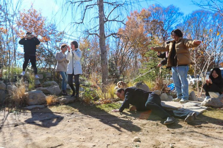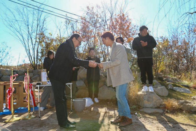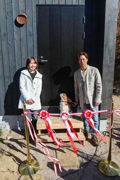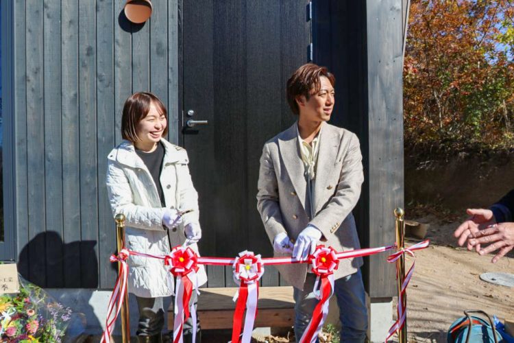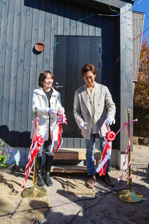 赤面する三瓶の合図でテープカットと同時に、クラッカー🎉の音が丘に響き渡ります。F様、この度はお引渡しおめでとうございます!㊗