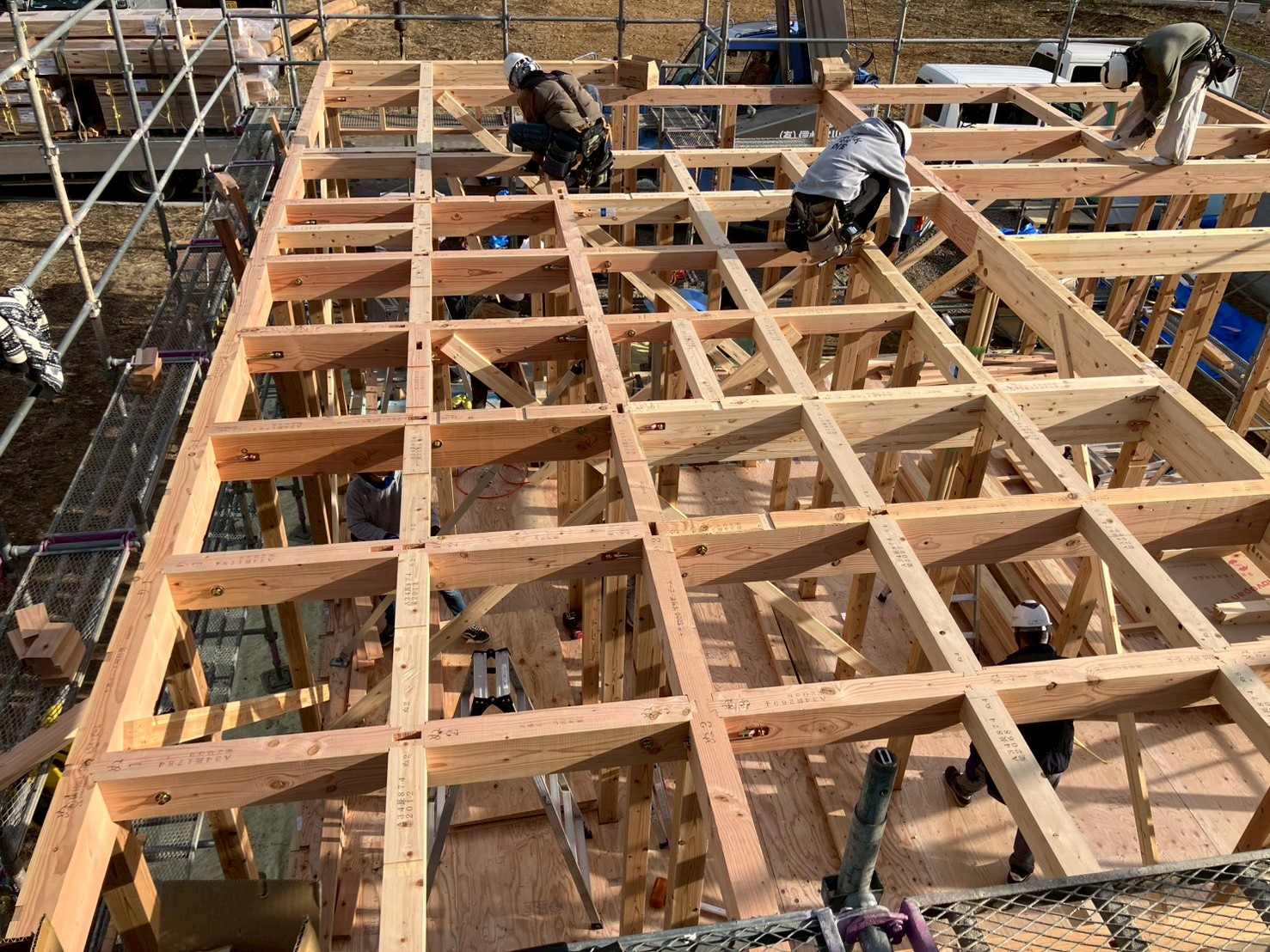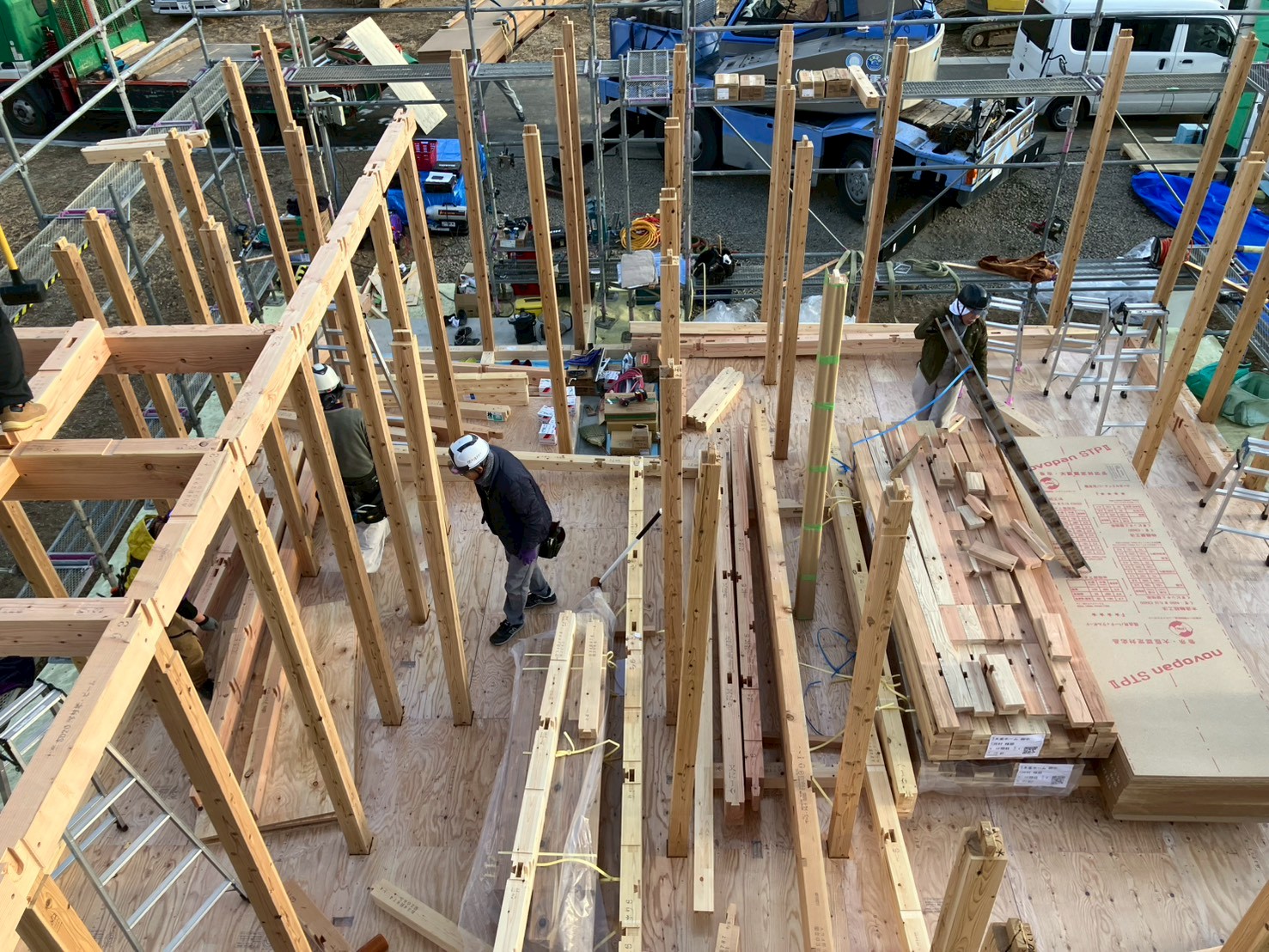 午前中のうちには、1階部分はほぼ組み上がってきます。碁盤の目のように、綺麗に組んである一部が四角く空いているのは、リビングの勾配天井になる部分です。