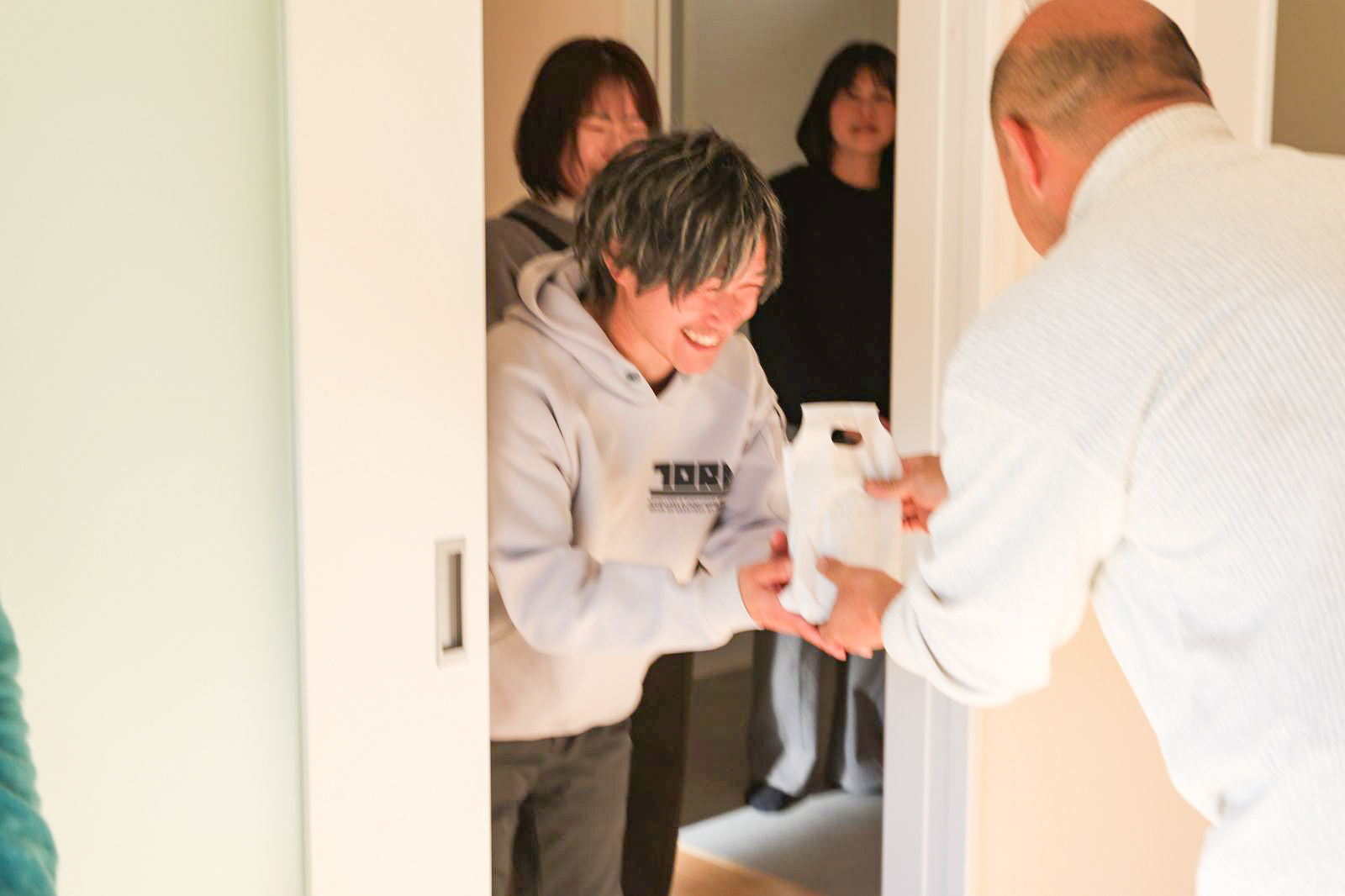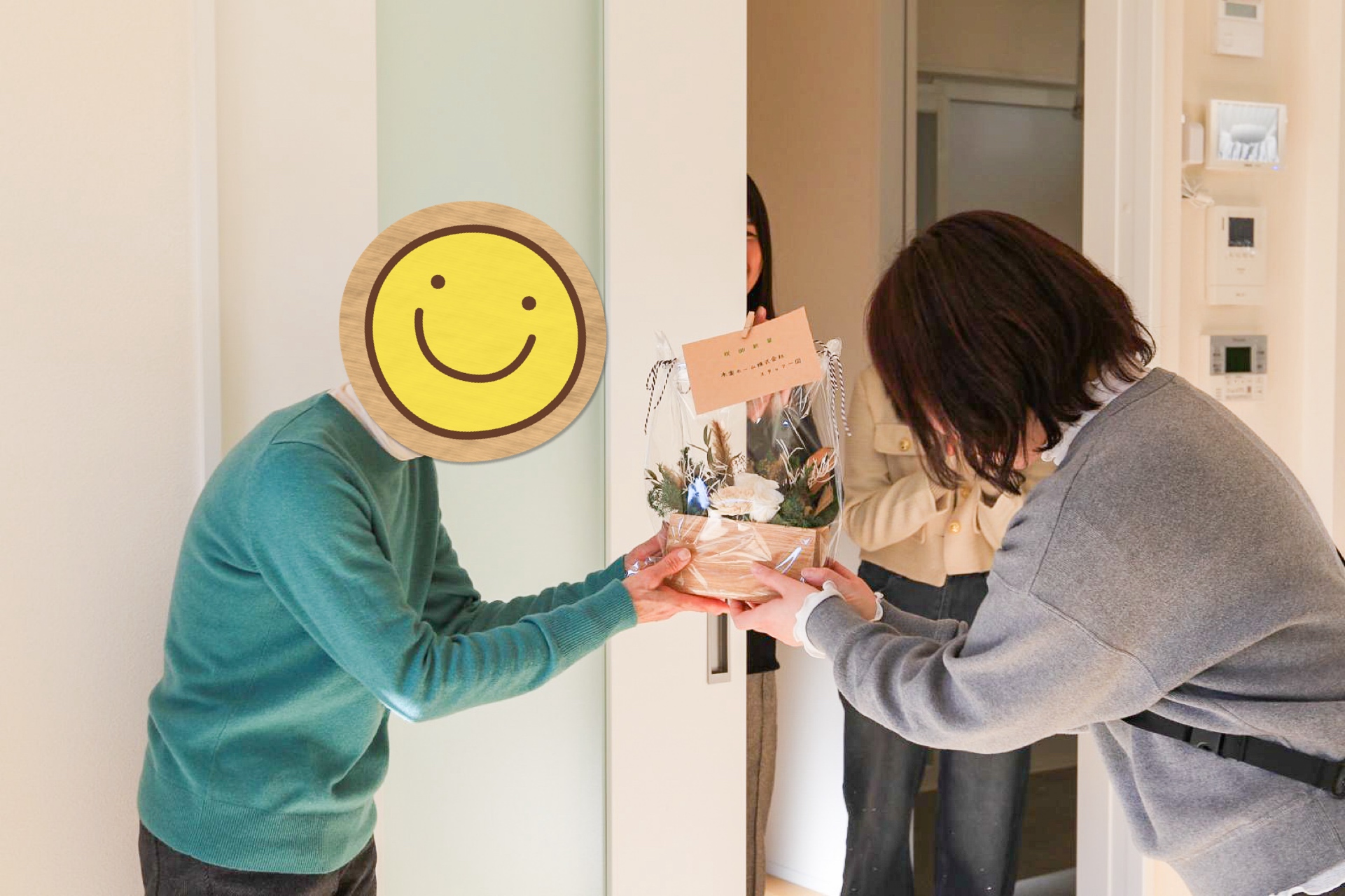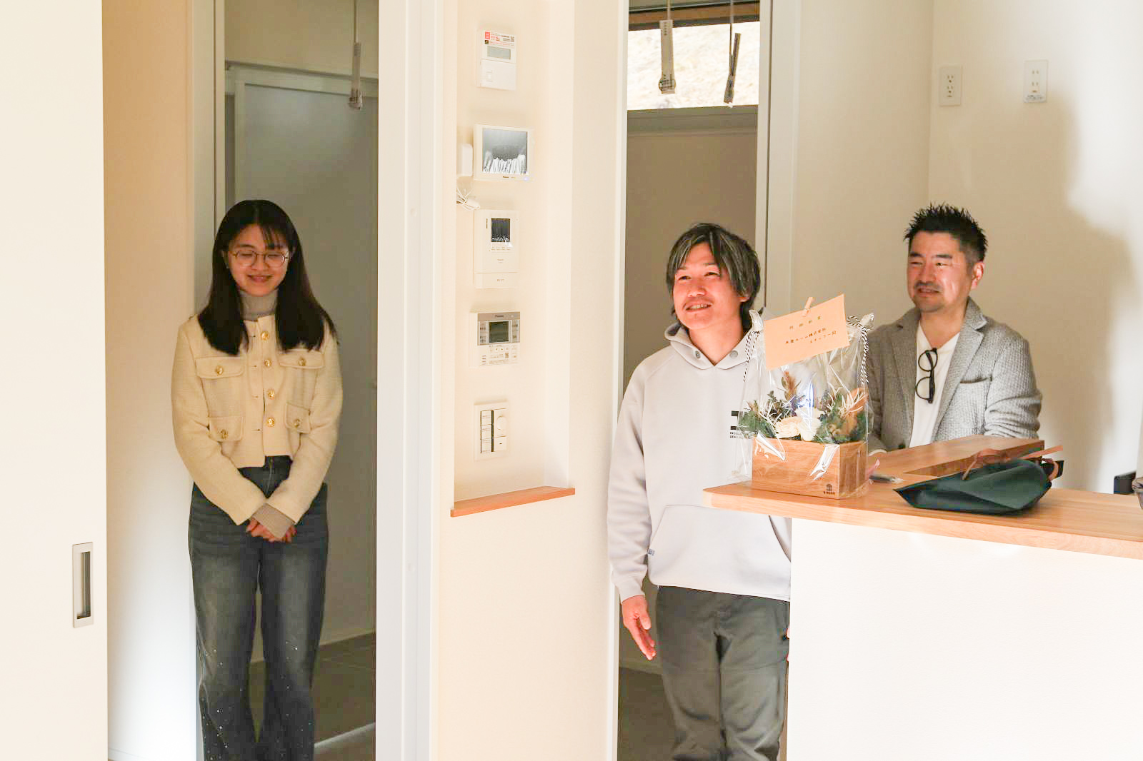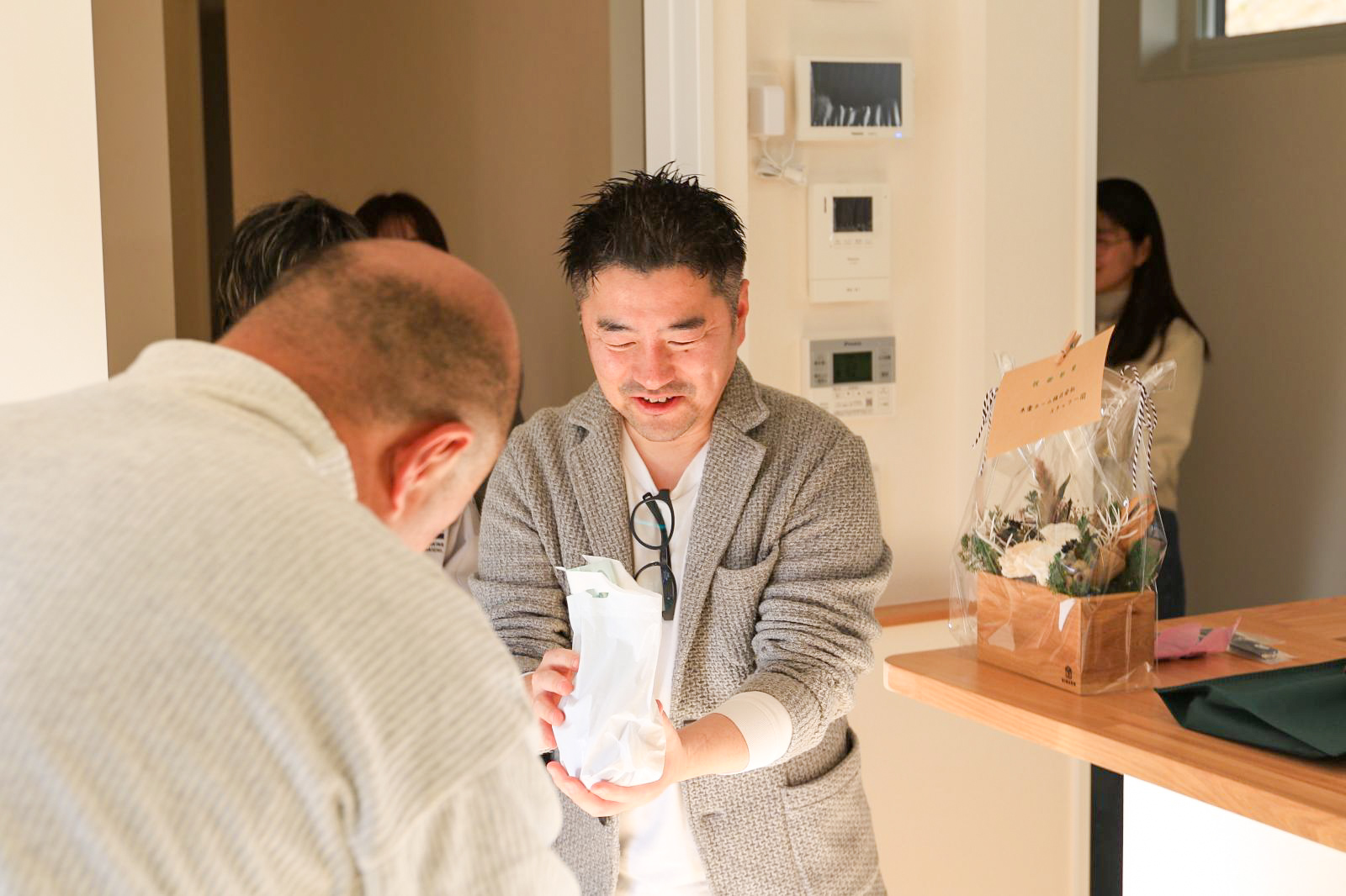 鍵が代わって、お客様となった我々工事担当者も中へ入らせていただいて、担当コーディネーターの大谷から記念品をプレゼント!