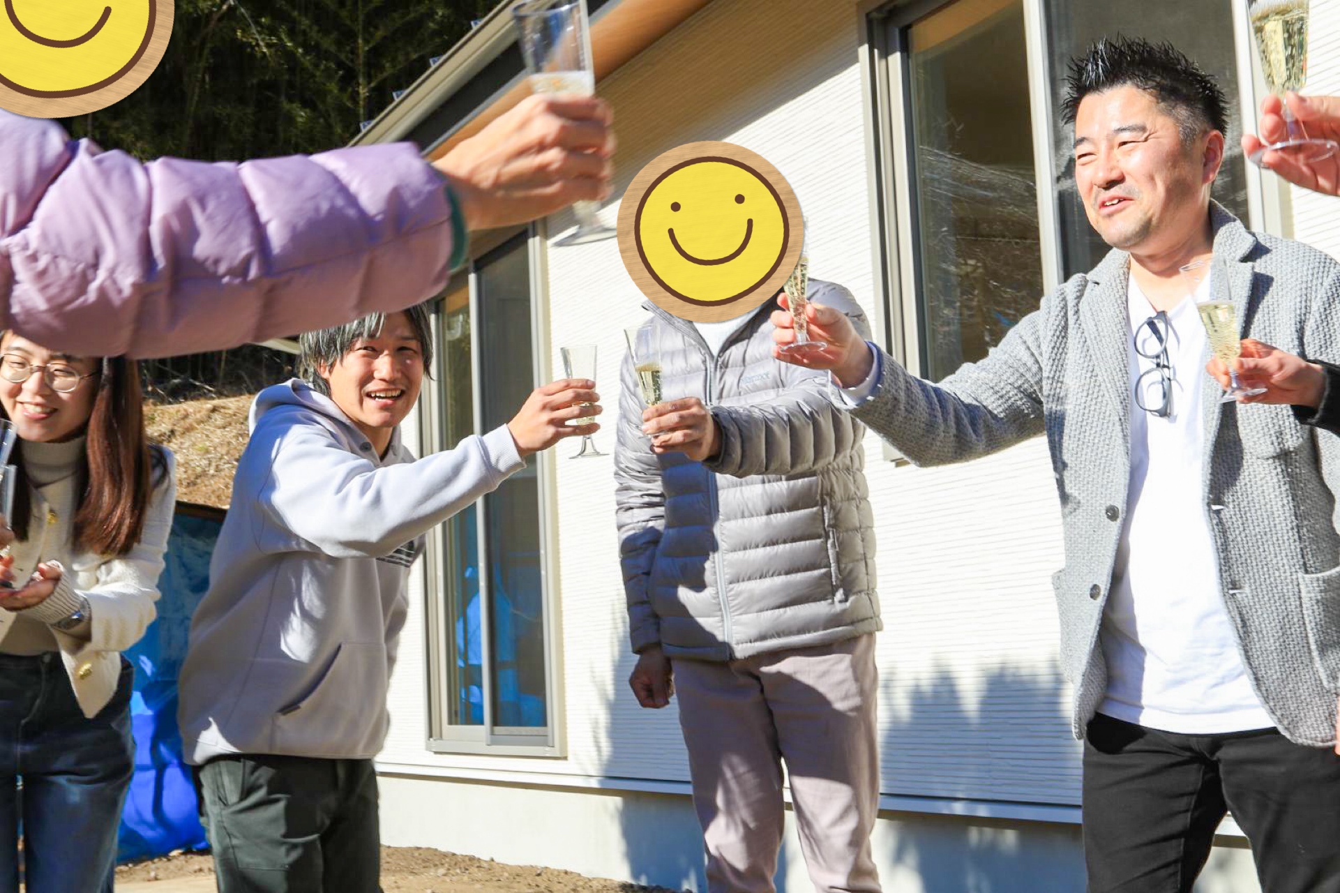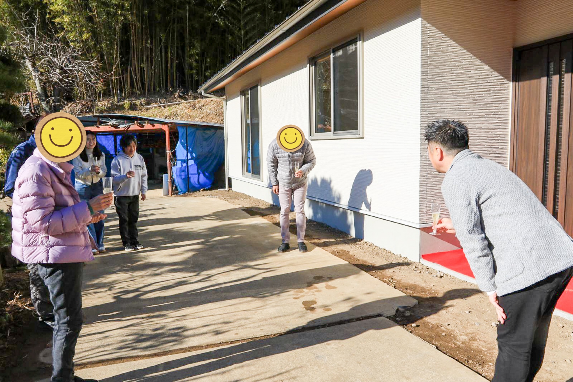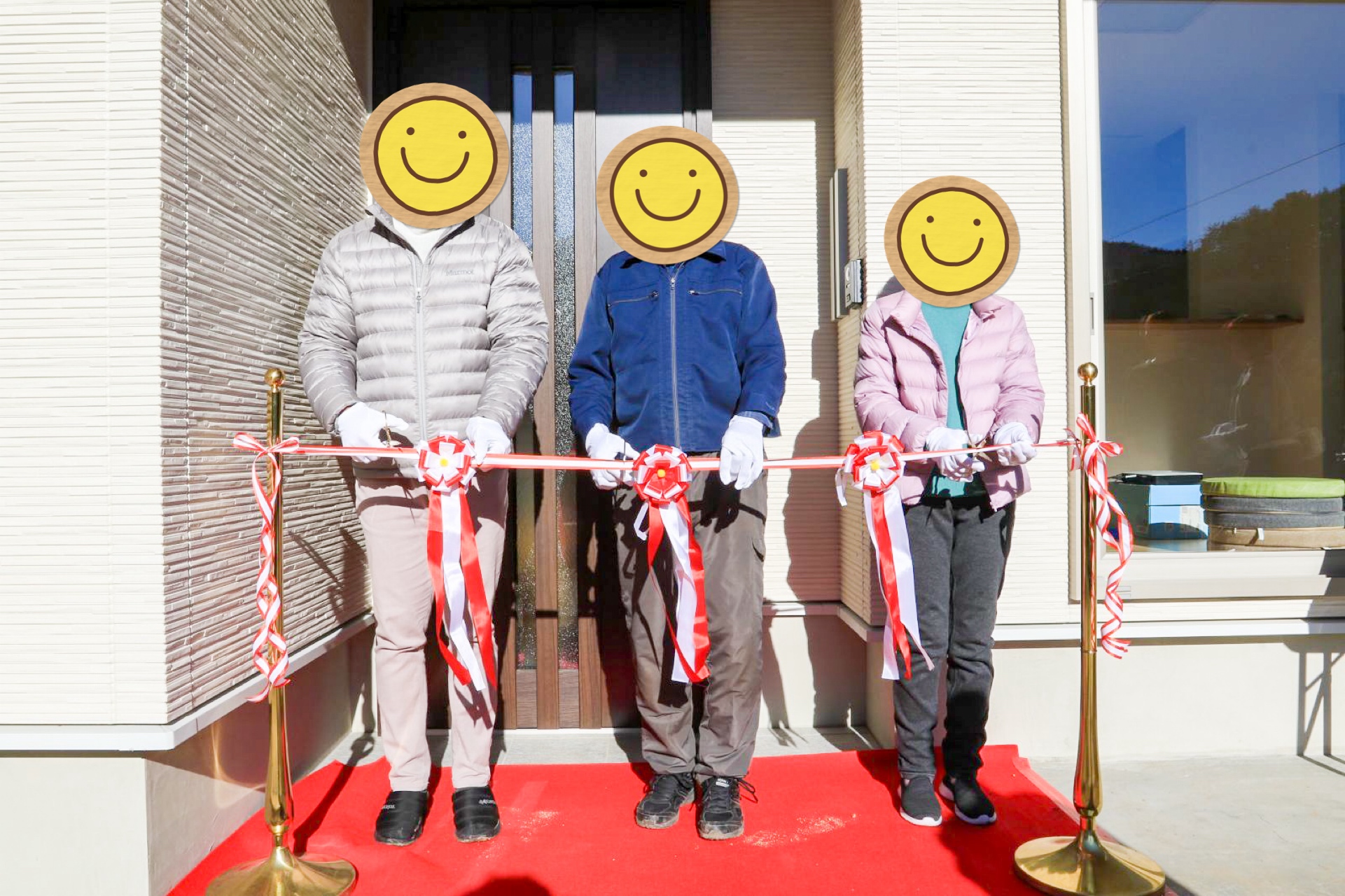 玄関前にて、テープカットシーンの撮影。M様は南側が玄関で冬の日差しがサンサンと照り付ける中、撮影のご協力ありがとうございました!