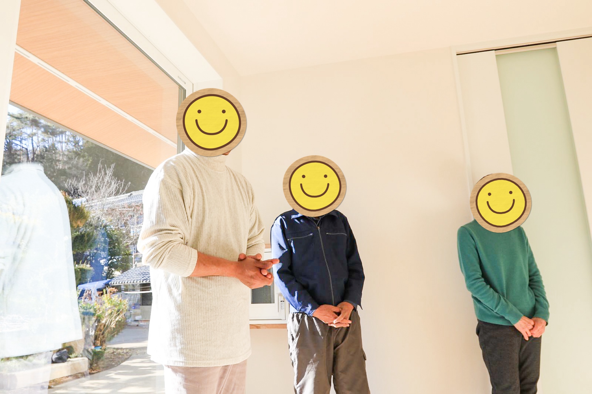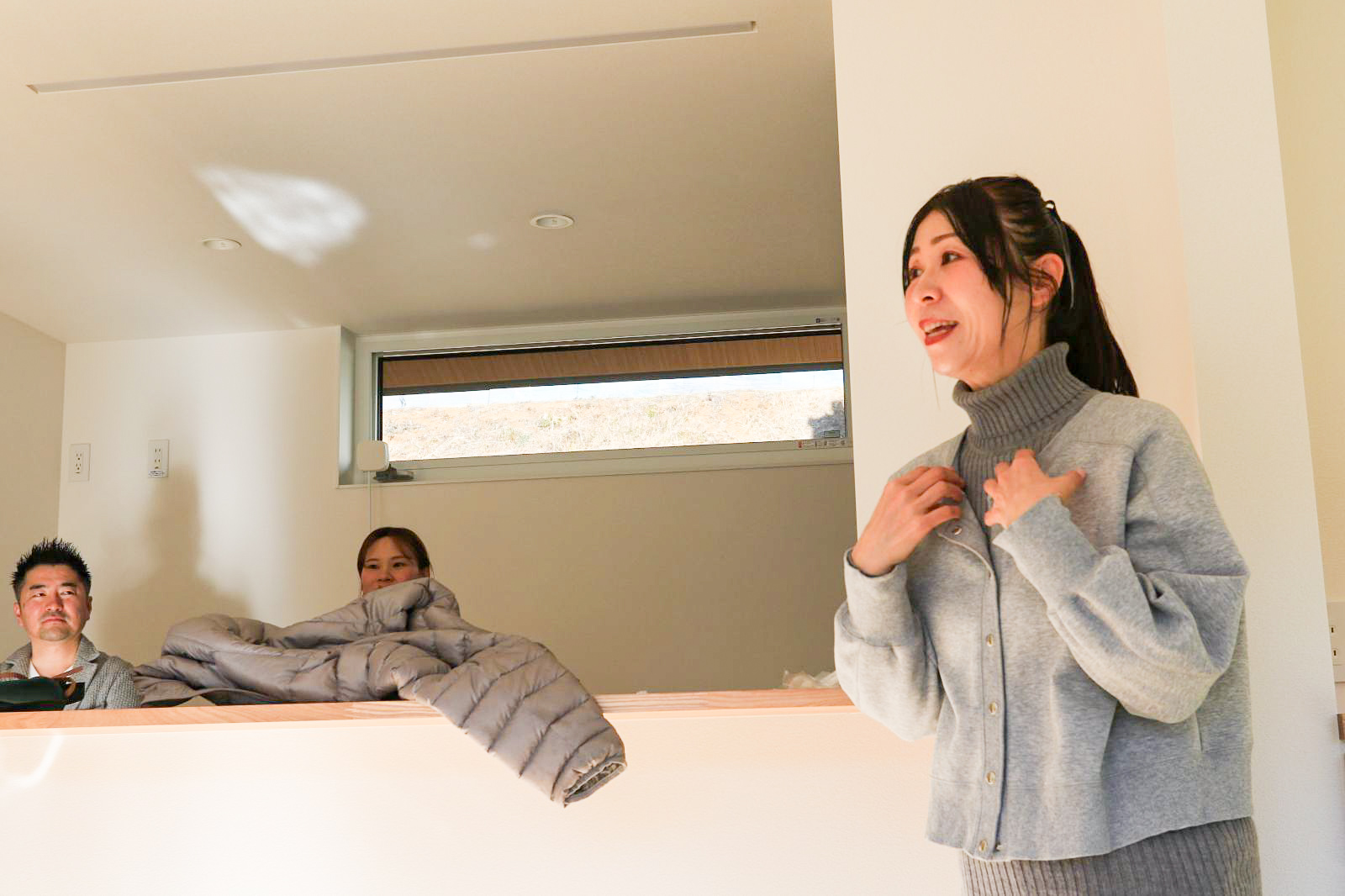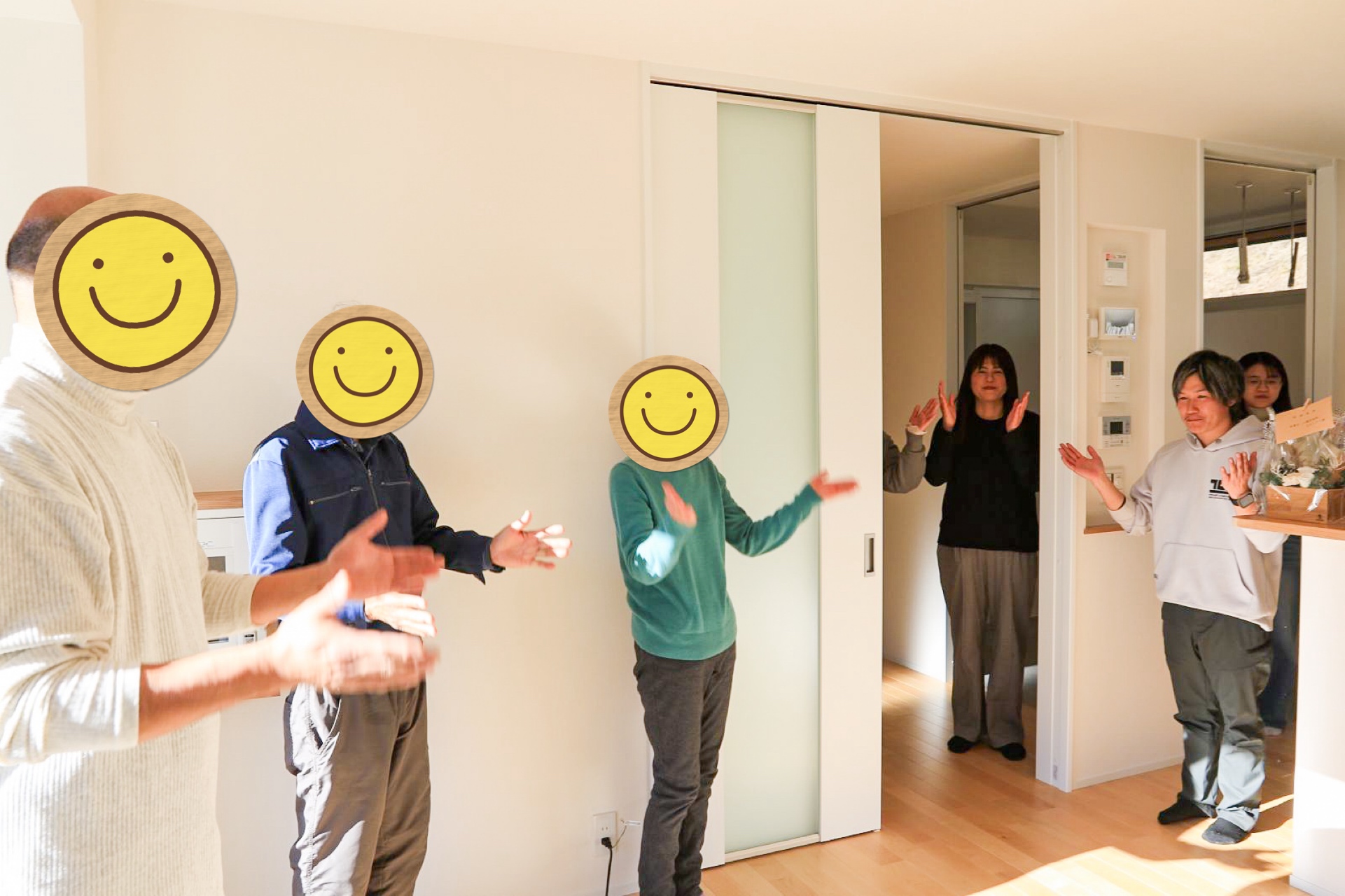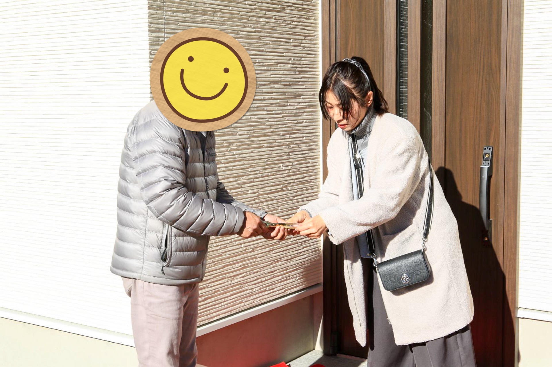 玄関前にて、テープカットシーンの撮影。M様は南側が玄関で冬の日差しがサンサンと照り付ける中、撮影のご協力ありがとうございました!