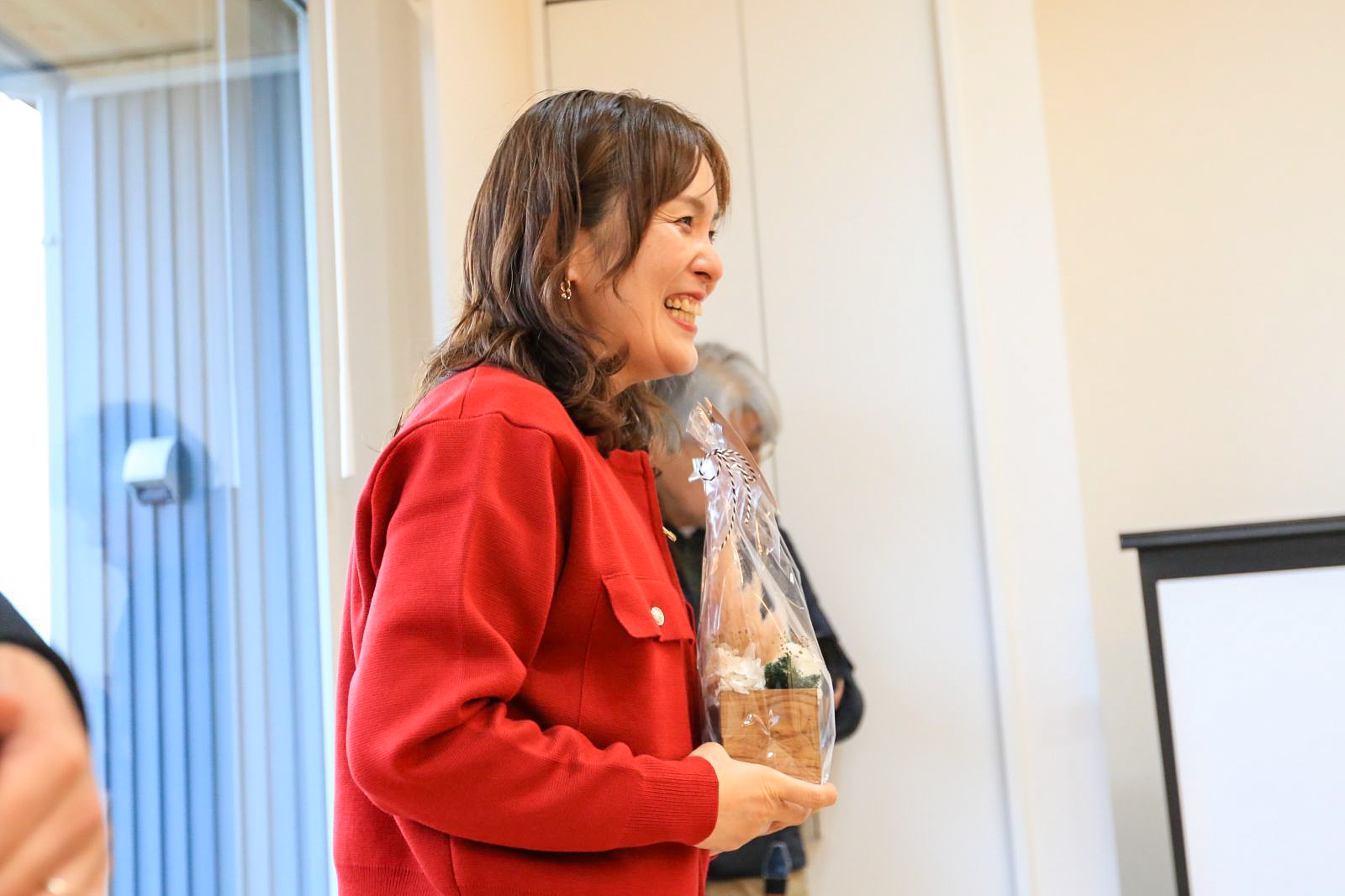 こちらもクリスマスカラーの衣装でお引渡しに臨んだ担当ICの吉田から、K様に記念のプリザーブドフラワーをお贈りします。