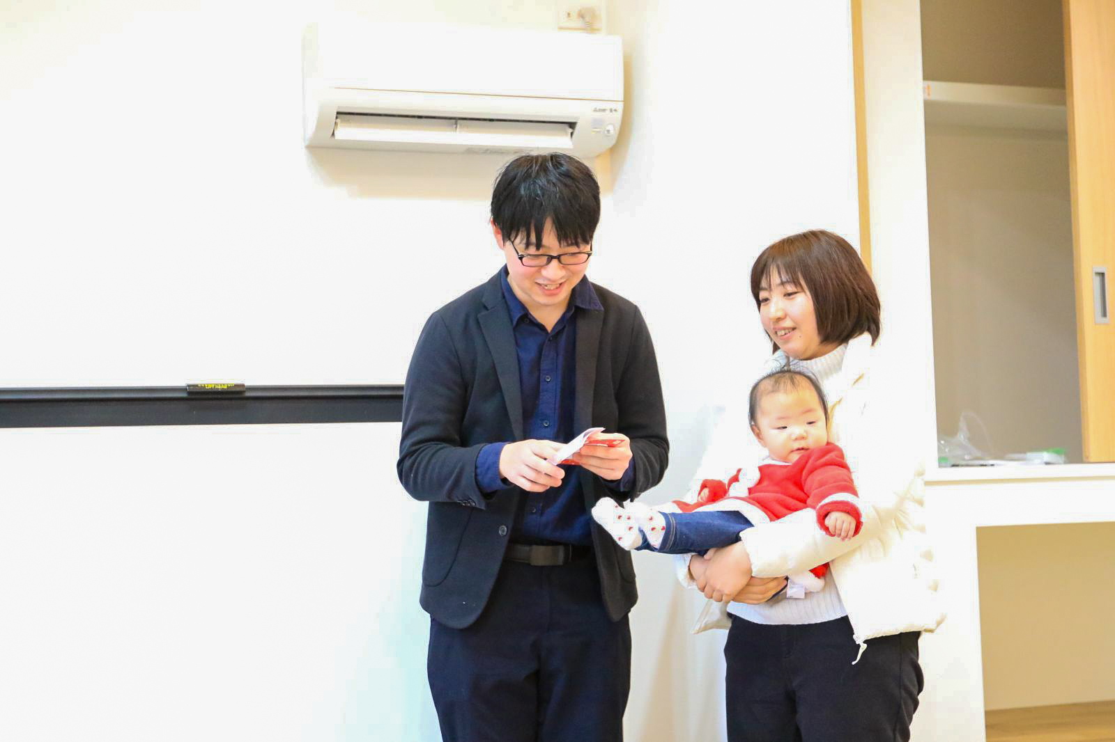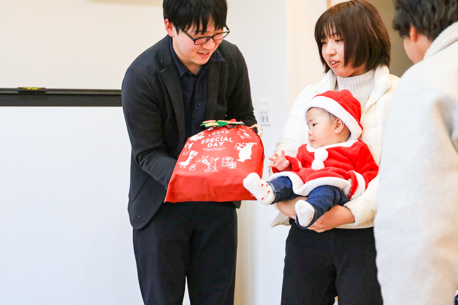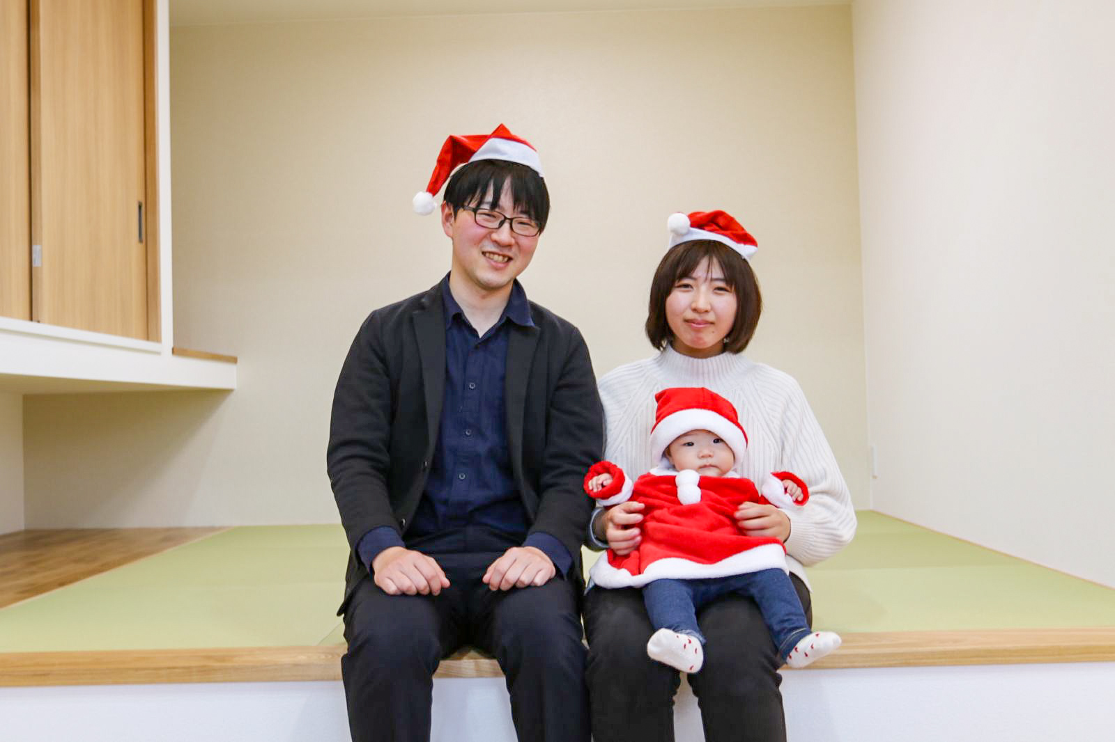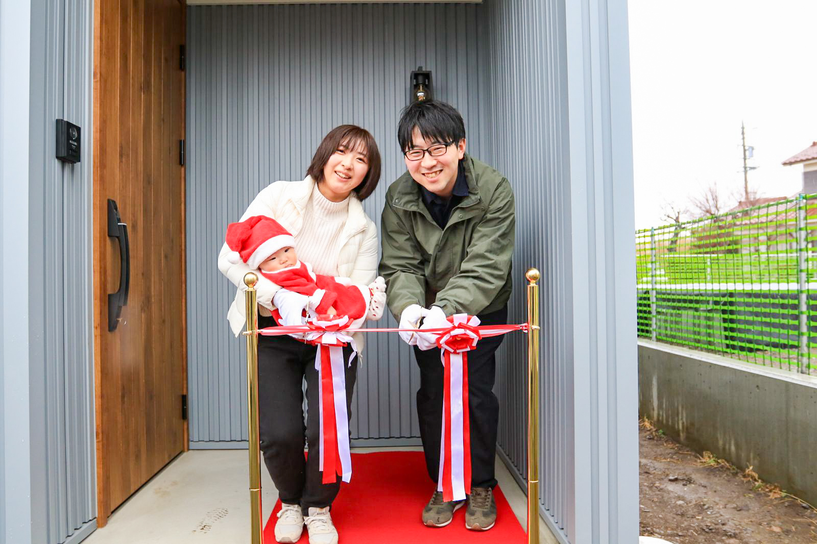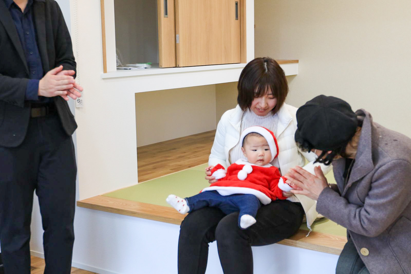 家づくりの途中でご出産された生後5か月少しのMちゃん、寒い中でしたが、外でのテープカットセレモニーにご参加いただきました。何と、Mちゃん「サンタさん🎅」の格好でご登場です!可愛い✨