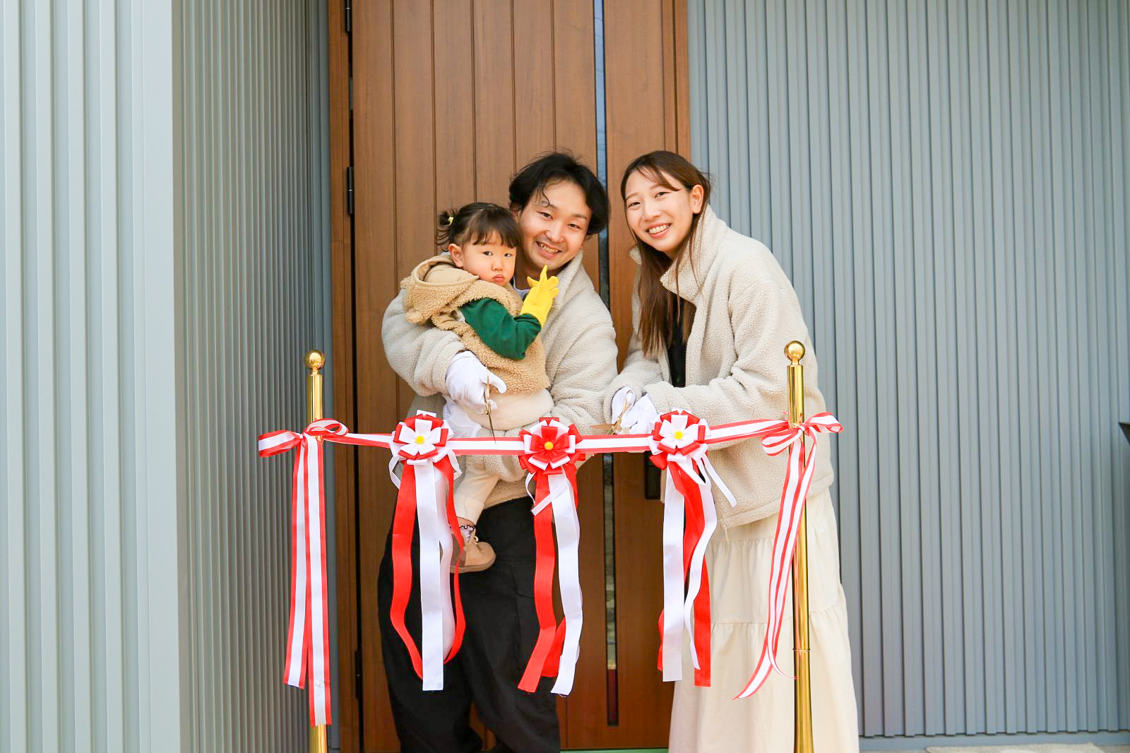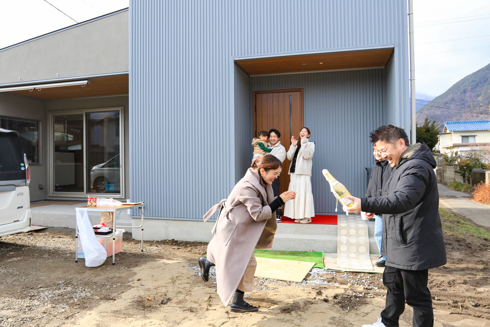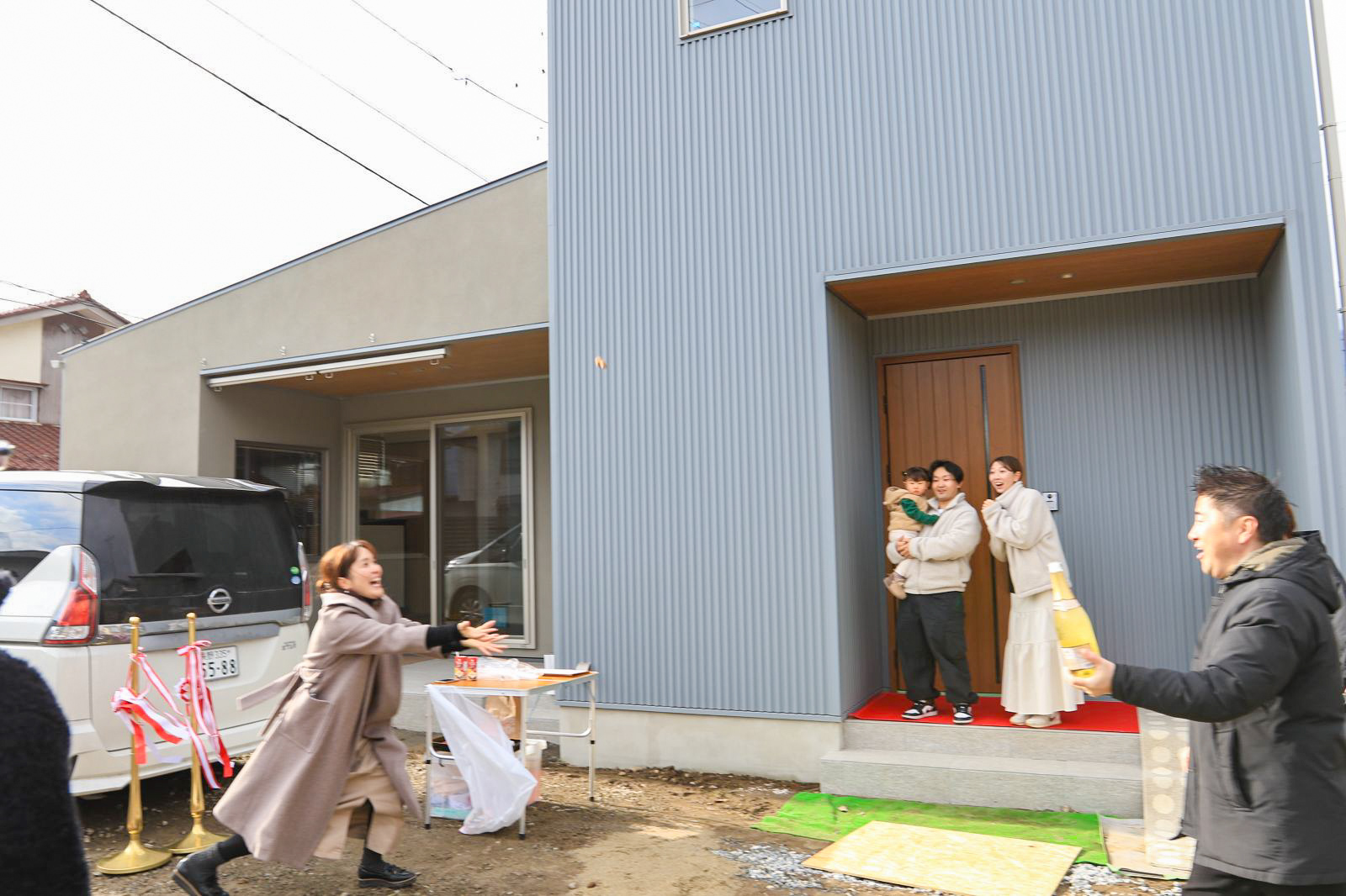 木楽ホームの特設レッドカーペットの横にあるのはお母様が急遽、ご用意してくださったマット。朝は曇っていた空に一筋の太陽の光が差し、晴れやかな気持ちで、吉田からお引渡しのお祝いの言葉を述べます。