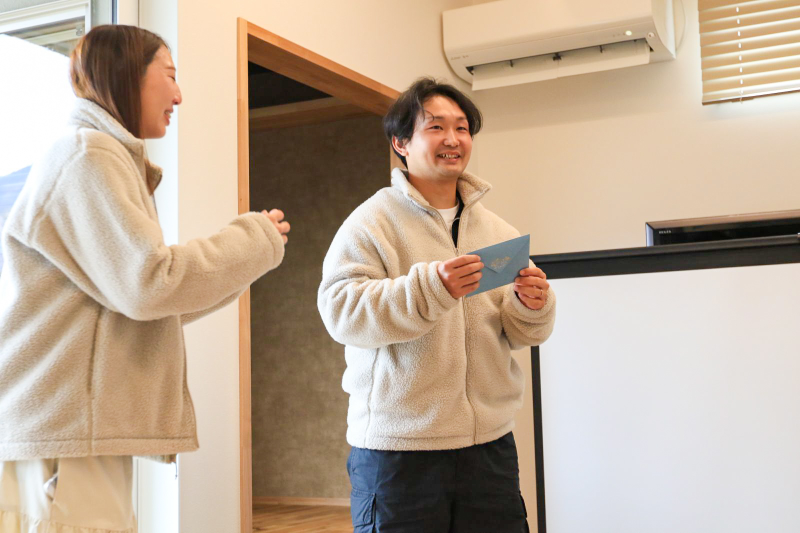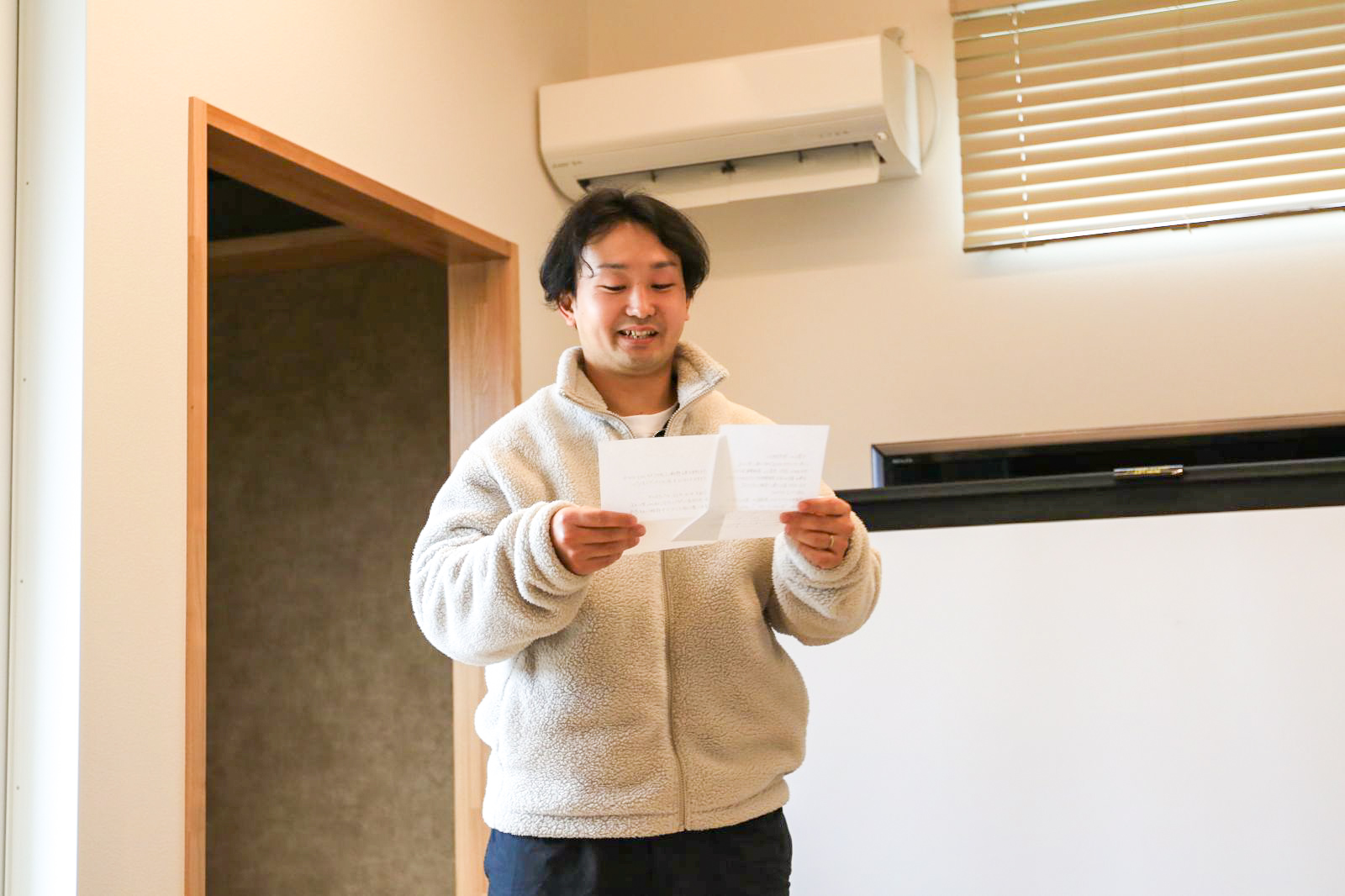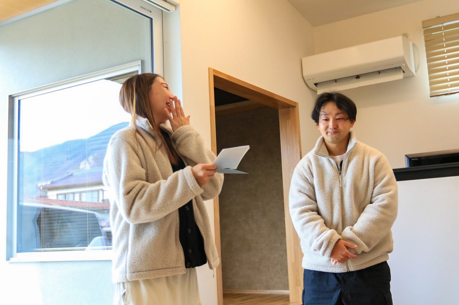 時々、涙を必死にこらえながら、ご主人への手紙を読んでくださいました。K様ご夫妻は、まだ20代。家づくりを決断するには相当な覚悟が必要です。そして、たくさんの会社を見られて、強く営業される会社にもしっかりとお断りされて、木楽ホームを選んでくださいました。その決断と家が完成したことに対しての奥様のご主人への思いを綴られた手紙に、スタッフも涙しました。