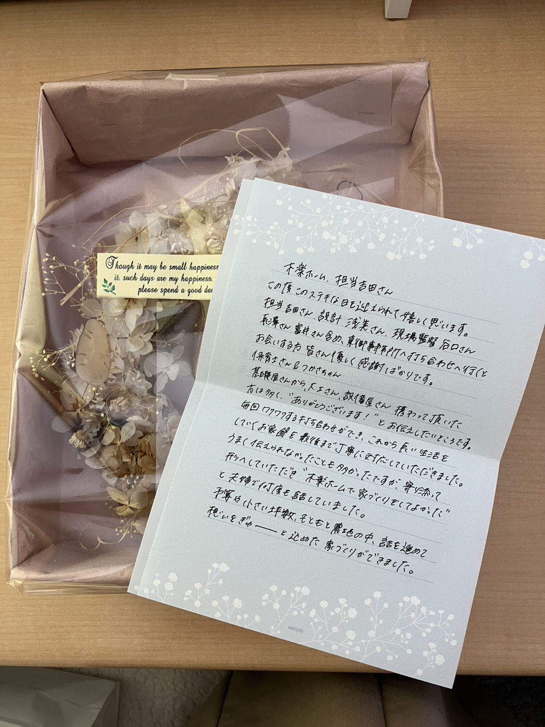 携わったスタッフ一人ひとりへの感謝の気持ちのお言葉と、「木楽ホームさんを選んで良かった」とメッセージをいただきました。K様は、本当にいつも打ち合わせを楽しみにされて、木楽ホームとの打ち合わせの前日は「明日打ち合わせだね!」とご夫婦でLINEをする程、楽しんで家づくりをしてくださいました。