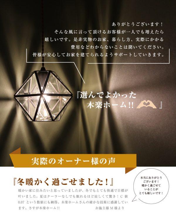 気密性0.07の家で、実際に冬をお過ごしいただいて、ご満足いただけました。