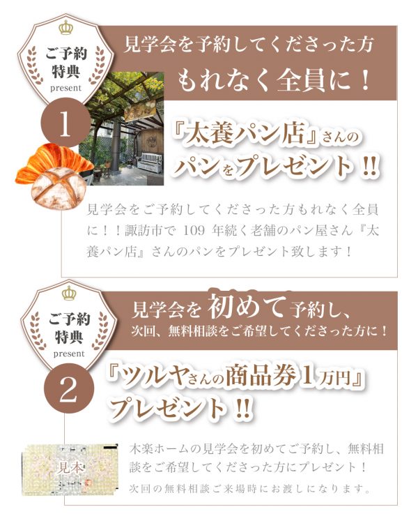 物価高の世の中、少しでもご来場のきっかけにしていただくために、ご来場の方全員へ「太養パン店」さんのパンをプレゼント!!さらに、ご来場後次回無料相談をご予約いただいた方には、ツルヤ商品券10,000円をご用意いたします。